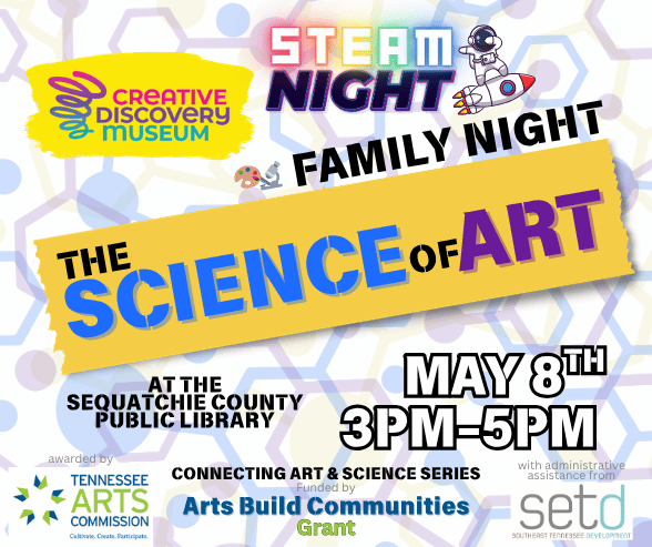 The Sequatchie County Public Library has received $3,200 from the Tennessee Arts Commission and the Southeast Tennessee Development District to host four Special Family Night programs with the Creative Discovery Museum in early 2026 – Connecting Arts & Sciences!🖌️🧪