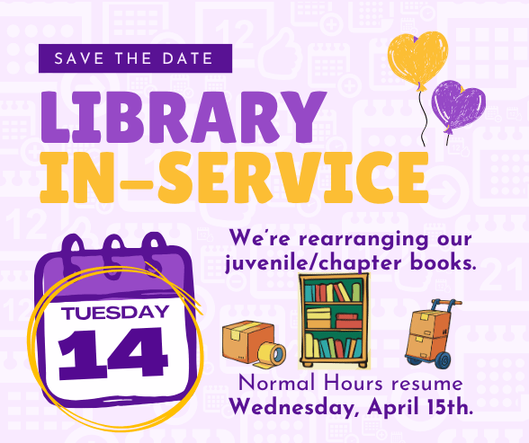 We’re giving our juvenile and chapter book area a little makeover! To ensure everyone’s safety while we rearrange and refresh the space, the library will be closed all day on Tuesday, April 14.