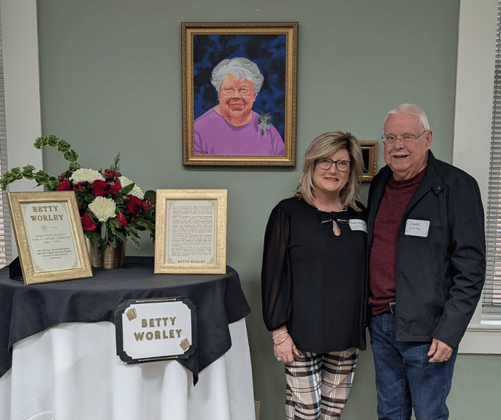 Director Robin Burgin and Jimmy Worley with the newly unveiled portrait of Miss Betty Worley.