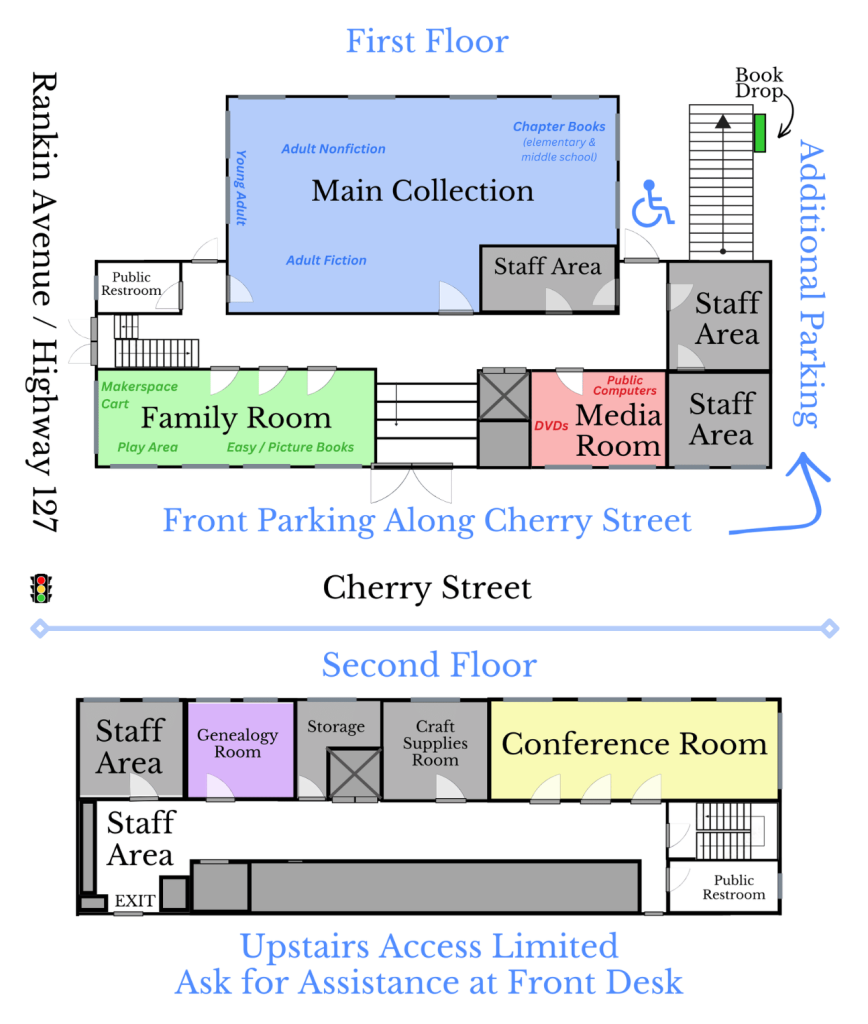 Our front doors located on Cherry Street are open. Patrons who require handicap access may enter the library using the back door located behind the book drop. Our doors on Rankin Avenue are not open at this time.