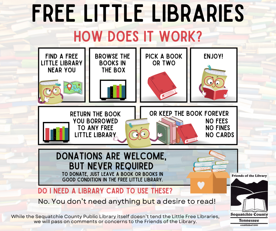 Contact the library by phone or at info@sequatchielibrary.org. While the Sequatchie County Public Library itself doesn’t tend the Little Free Libraries, we will pass on comments or concerns to the Friends of the Library.