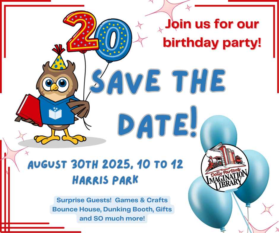 Join us on August 30th at Harris Park from 10AM to 12PM as we celebrate 20 Years of Imagination Library!